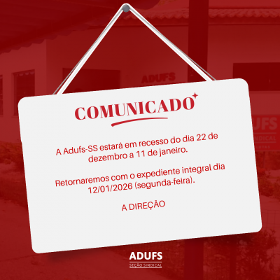 Comunicamos a todas e todos que o período de recesso da ADUFS acompanhará o recesso acadêmico da instituição. Entre os dias 22 de dezembro e 11 de janeiro não teremos expediente em nossa sede, no Campus São Cristóvão. Os trabalhos e atendimentos serão retomados em 12 de janeiro de 2026. Tendo em vista o recesso forense, entre os dias 12 e 20 de janeiro os atendimentos da Assessoria Jurídica ocorrerão de forma remota, através do número 79 8821-0001 com a advogada Gabrielle Lobo.