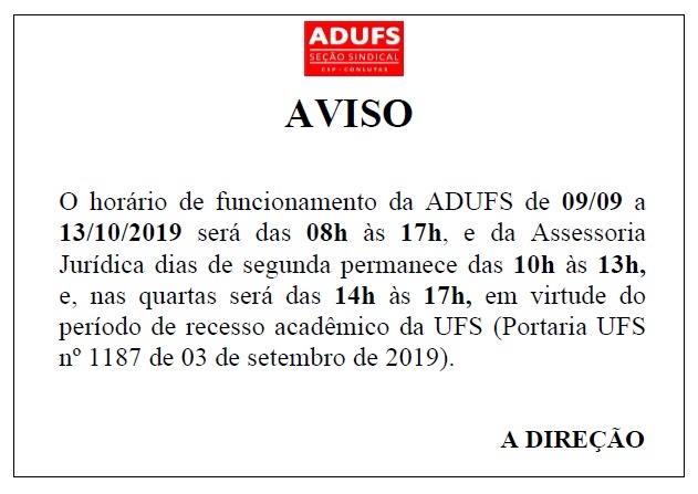 O horário de funcionamento da ADUFS de 09/09 a 13/10/2019 será das 08h às 17h, e da Assessoria Jurídica dias de segunda permanece das 10h às 13h, e, nas quartas será das 14h às 17h, em virtude do período de recesso acadêmico da UFS (Portaria UFS nº 1187 de 03 de setembro de 2019).