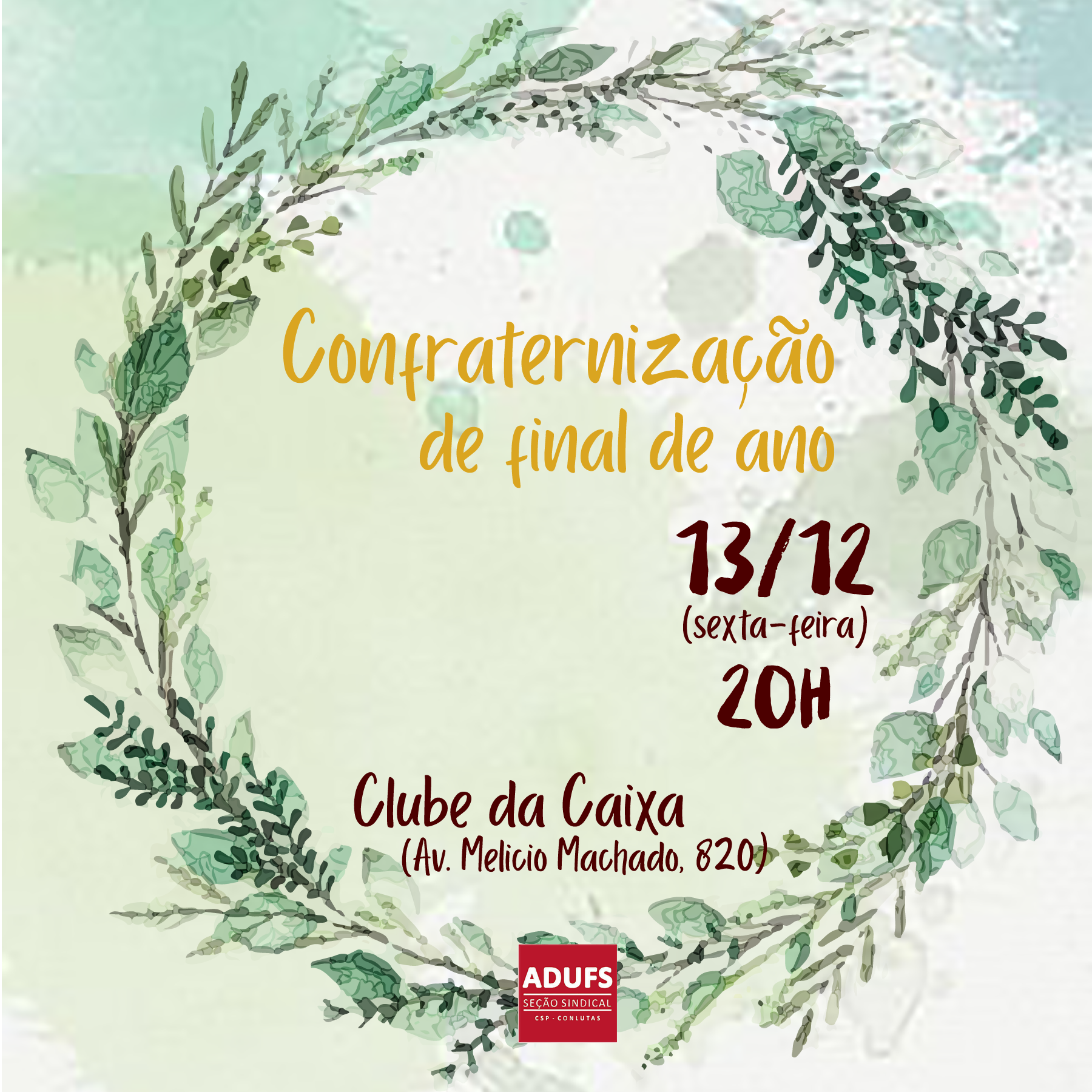No dia 13 de dezembro, a ADUFS realizará a Confraternização de final de ano. A festa, que será um momento de renovar as esperanças e energias para 2020, acontecerá no Clube da Caixa, a partir das 20h.