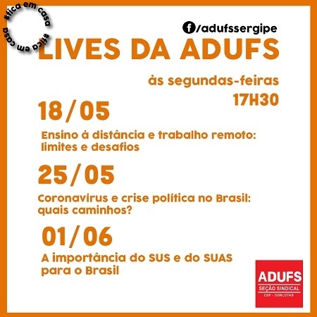 As Lives da ADUFS acontecerão às segundas-feiras, 17h30, com transmissão ao vivo pelo Facebook do sindicato (https://www.facebook.com/AdufsSergipe)