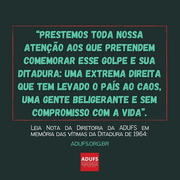 A Diretoria da ADUFS vem a público manifestar seu total repúdio a todos(as) aqueles e aquelas que pretendem comemorar, neste março de 2021, o golpe de estado de 1964 e a ditadura que se seguiu ao golpe.