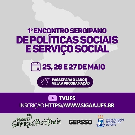 Em referência ao Dia do/a Assistente Social, celebrado no último dia 15 de maio, o Coletivo de Assistentes Sociais Resistência e Luta e o Grupo de Estudos e Pesquisas em Fundamentos, Formação em Serviço Social e Políticas Sociais (GEPSSO), vinculado a Universidade Federal de Sergipe (UFS), realizarão o I Encontro Sergipano de Políticas Sociais e Serviço Social, nos dias 25, 26 e 27 de maio, com transmissão ao vivo pelo youtube da TV UFS.