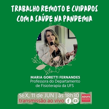 Este cenário exige ainda mais cuidados com a saúde. É para discutir estas e outras questões que a ADUFS realizará, nesta sexta-feira, 11/06, uma Live sobre “Trabalho remoto e cuidados com a saúde na pandemia”, com a participação de Maria Goretti Fernandes, professora do Departamento de Fisioterapia da UFS.