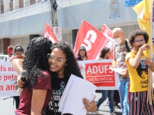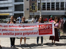 A professora de Serviço Social da UFS e Secretária Geral da Adufs Milena Barroso representou a Associação durante o Ato do 8 de Março. "Não há luta da classe trabalhadora sem a luta das mulheres", frisou ao lembrar as desigualdades que as mulheres ainda vivenciam em diversos espaços e defender a pararidade de gênero como política contra o machismo.